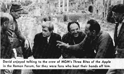 been-for look where it had gotten him. A man who has been driven towards one goal all his life doesn't all-of-a-sudden change his mind when he has his first foothold on his dream. There must be something more behind this simple battle-fatigue. When asked to explain why he considers quitting his career, he double-talks about privacy and all that. He's never hidden the fact that he dislikes (hates is a better word) the mayhem caused whenever he appears in public. And that is why you will never see David in a personal appearance again.